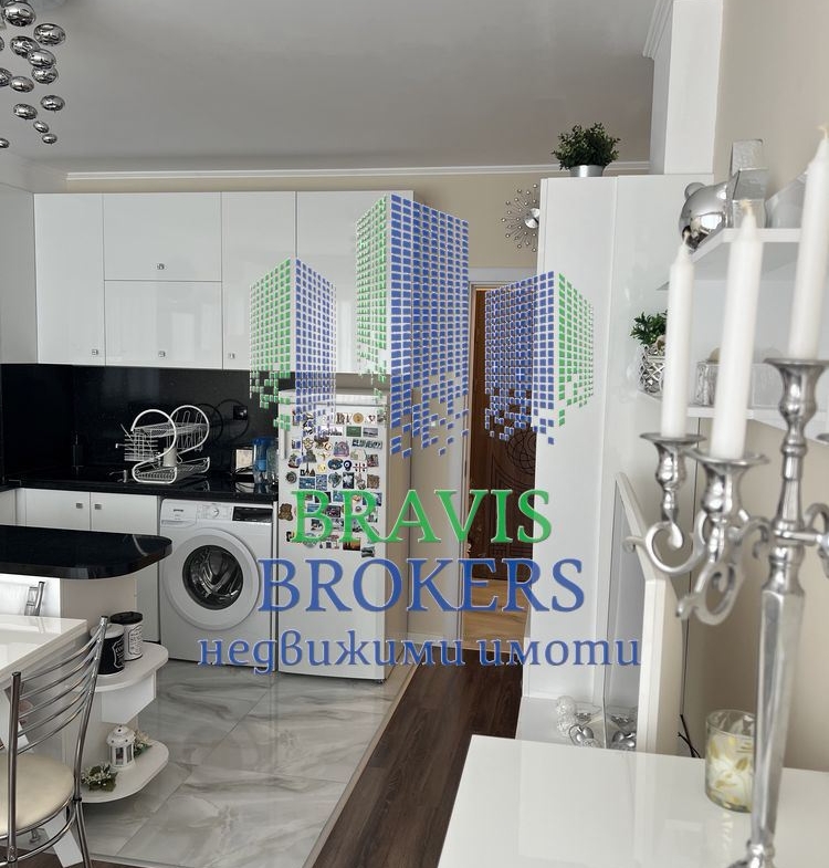 Луксозно обзаведен апартамент , двустаен . Състои се от: антре, килер с гардероб и рафтове до тавана, шкаф за обувки, закачалки, баня и тоалетна заедно, с теракот пода и стените до тавана, стъкло зад душа, мивка със шкаф, бойлер. Хол голям със кухненски бокс, с всички уреди-пералня, хладилник, машина за кафе, микровълнова, керамични котлони, вградена фурна, дълъг плот с шкафове, шкафове по стените, секция с нов голям телевизор, интернет, маса разтегателна, два дивана, единият е разтегателен. Всички мебели са лачени, правени по поръчка – бели в комбинация с чер мрамор – мивка , плот. Спалня с двойна спалня, гардероб, нощни шкафчета, огледала, нощни лампи, полюлеи. Хол и спалня с врати към терасата, окачени на тавана простири, южно изложение на апартамента, ново строителство, етаж 8 от 9, с асансьор. Близо до спирка на автобуси, до пазар с много магазини, .