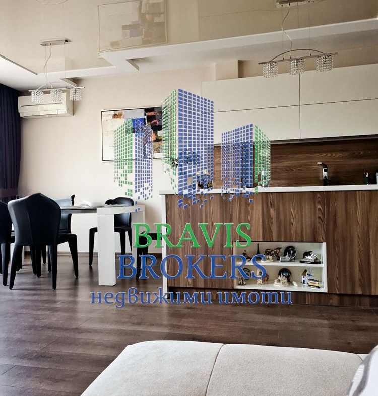 Състояние : Имотът е завършен с висококачествени материали: терасасата е с гранитогрес, декоративни италиански мазилки, висок клас вградена техника,два броя инверторни климатици (Mitsubishi), кухненският плот и остров са от качествени материали и Blum механизми.Дограмата е петкамерна PVC. Към апартаментът има и избено помещение.