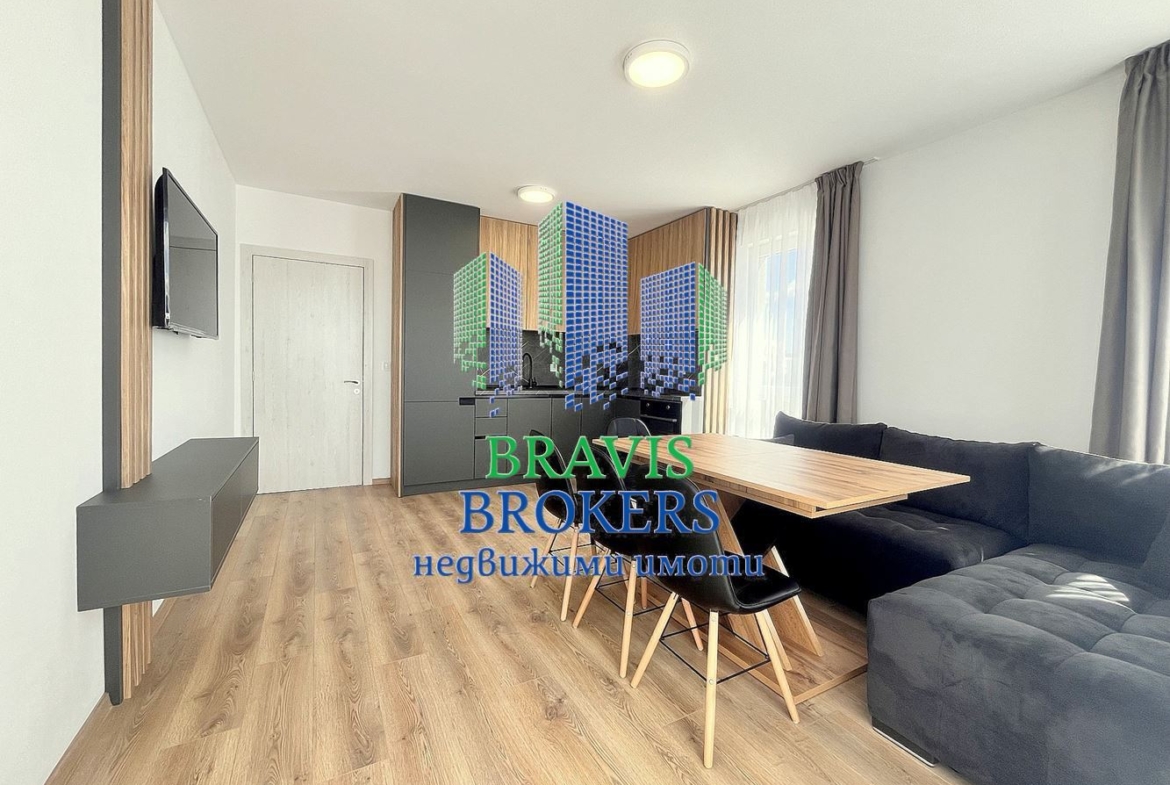 Имотът представлява : Входно антре, просторна и слънчева всекидневна с напълно оборудвана кухненска част, мека мебел и трапезна маса;две функционални спални, комбинирана баня с тоалет, панорамна тераса. Жилището е разположено на Трети среден етаж в нова модерна жилищна сграда, с правилни форми на стаите.