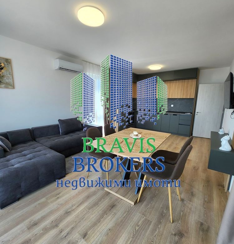 Имотът представлява : Входно антре, просторна и слънчева всекидневна с напълно оборудвана кухненска част, мека мебел и трапезна маса;две функционални спални, комбинирана баня с тоалет, панорамна тераса. Жилището е разположено на Трети среден етаж в нова модерна жилищна сграда, с правилни форми на стаите.