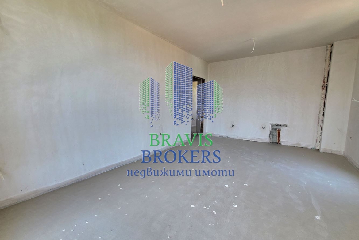 Имотът представлява : Входно антре, просторна всекидневна с обособена кухненска част с излаз на тераса, просторна слънчева спалня с излаз на тераса, баня с тоалет. Жилището се намира в ново строяща се сграда на среден етаж с правилни форми на стаите.